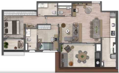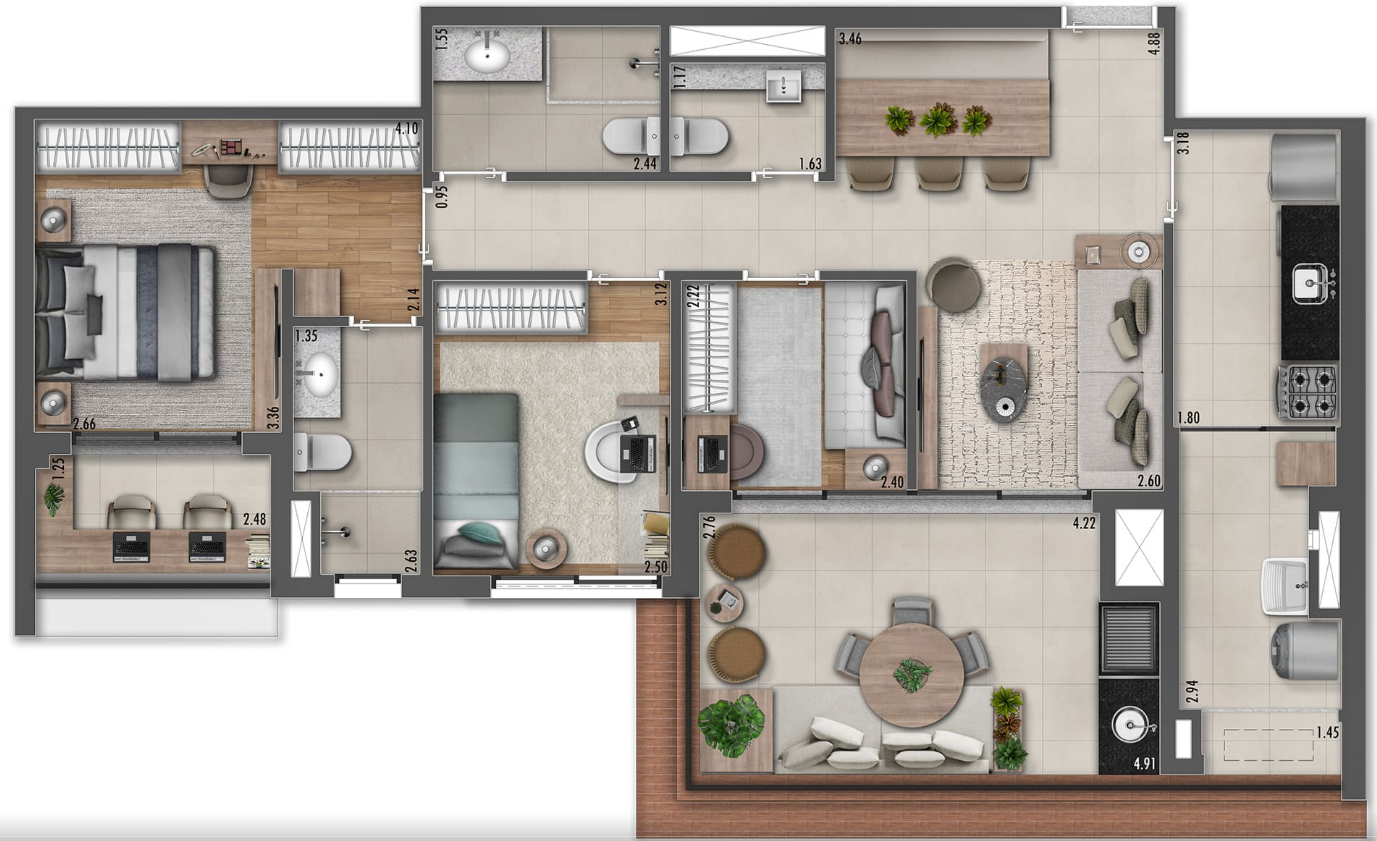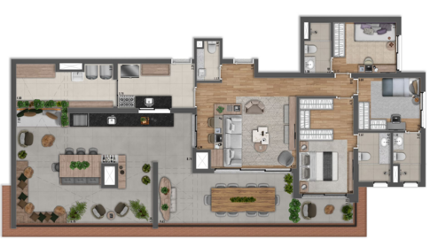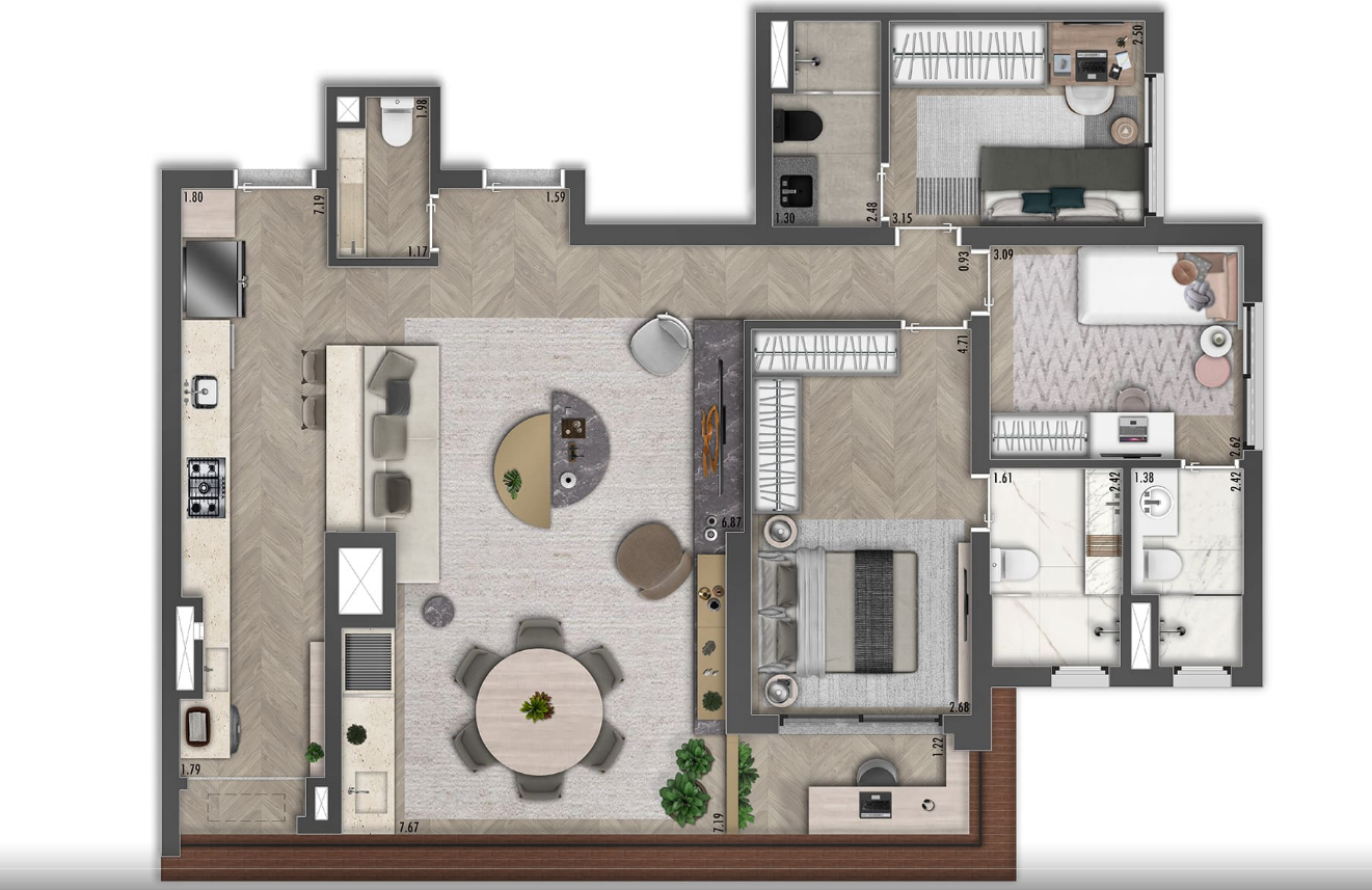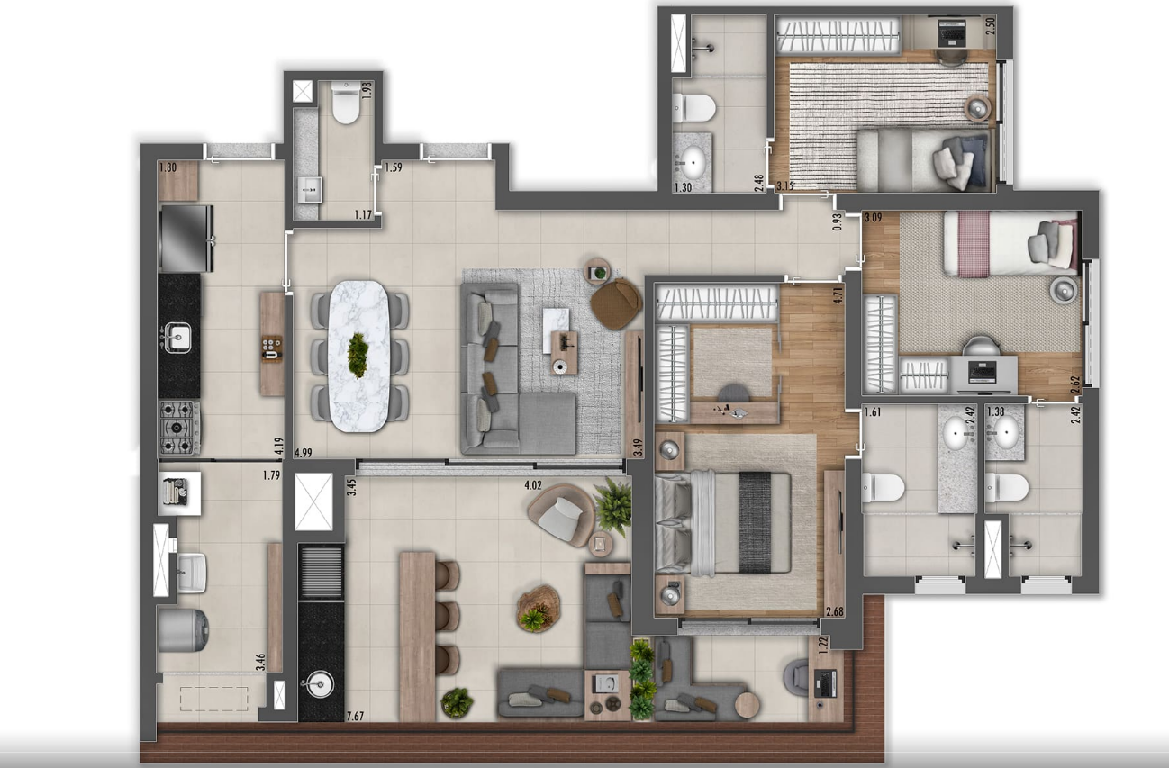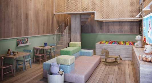 O condomínio é composto por uma torre única com 88 unidades, que incluem apartamentos de 95 m² a 113 m² com três dormitórios, gardens de 117 m² a 155 m², penthouses de 162 m² a 177 m² e studios de 24 m² a 28 m², todos projetados para proporcionar conforto e bem-estar. O lazer é completo, com piscinas adulto e infantil, sauna, sala de massagem, academia, salão de festas e gourmet integrados, churrasqueira, quadra esportiva, playground, brinquedoteca, pocket park com pet place, redário, lareira ecológica externa, espaço delivery com lockers, lavanderia equipada, coworking com lockers, bicicletário e vaga para recarga de carro elétrico.